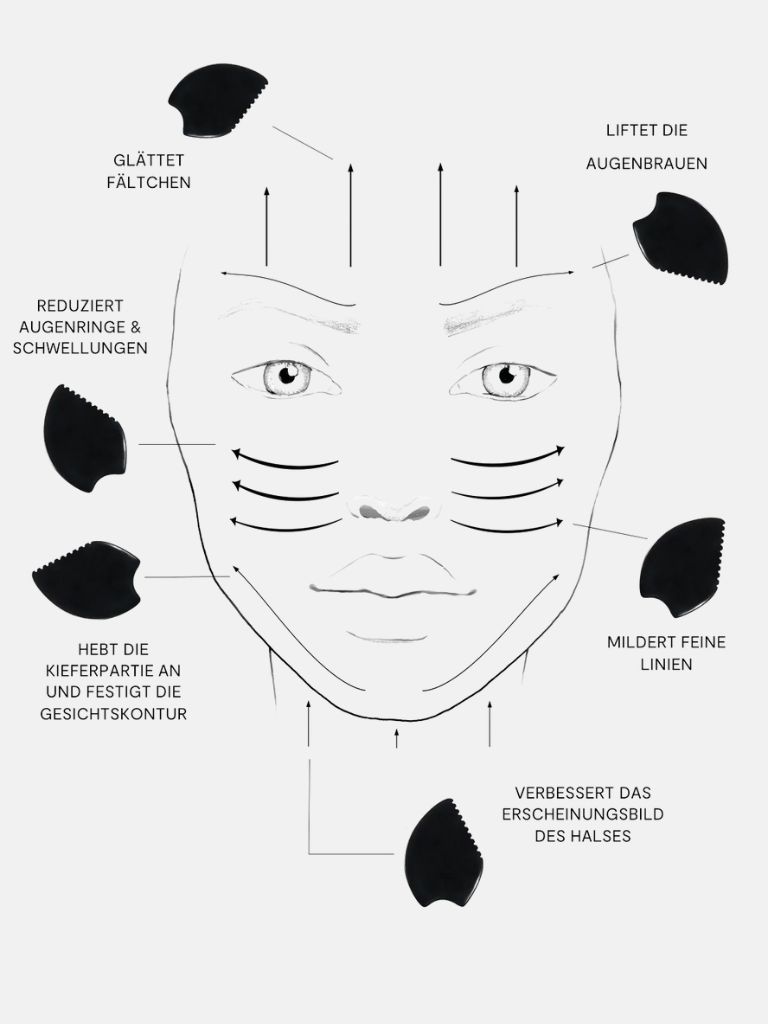 Der Gua Sha Empress Bian Stone hat eine handliche Grösse von 9,5 cm x 7 cm. Achte bei der Anwendung darauf, sanften Druck zu verwenden, insbesondere im Bereich um die Augen. Dem Bild kannst du die Bewegungen bei der Anwendung entnehmen.
