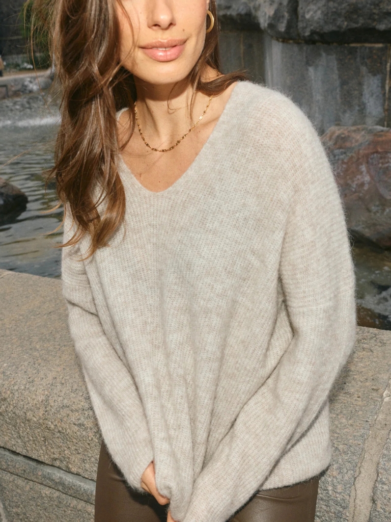 Diese Sweater kannst du immer wieder tragen – saison nach saison. Hergestellt aus einer leichten Mischung aus Alpaka und Wolle, hat sie einen tiefen, schmeichelhaften V-Ausschnitt und abgesenkte Schultern. Die lockere und lässige Passform macht sie perfekt für jeden Anlass. Kombiniere sie gerne mit Jeans oder trage sie über einem Kleid. Material: 33% Alpaka 33% Wolle 29% Polyamid 5% Elasthan. Sehr locker ausgemessen. Vielen wählen ein Nummer kleiner