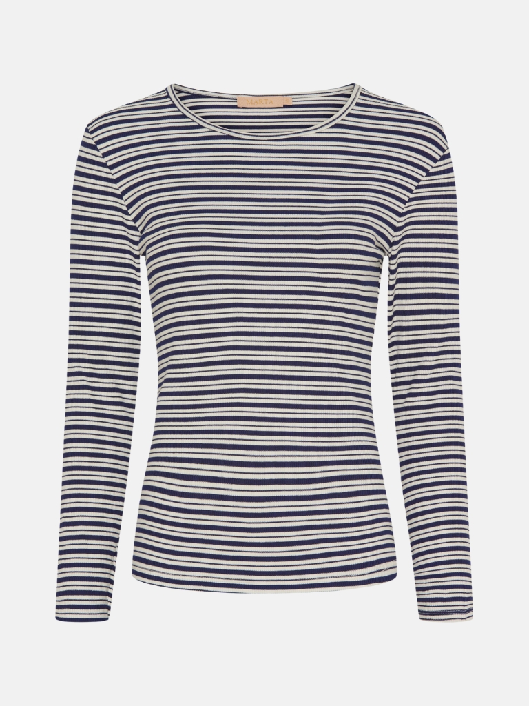 Elegantes langärmliges T-Shirt mit Streifen von Marta. Dieses schöne T-Shirt vereint Stil und Komfort perfekt. Es ist mit einem klassischen Rundhalsausschnitt und langen Ärmeln gestaltet, wodurch es sich ideal für den Alltag sowie für etwas formellere Anlässe eignet. Der weiche und leichte Stoff sorgt für eine bequeme Passform, während die schönen Streifen deinem Outfit einen trendigen und modernen Touch verleihen. Das T-Shirt lässt sich leicht mit Jeans für einen lässigen Look oder mit einem Rock für einen feminineren Stil kombinieren. Egal, wie du es trägst, dieses T-Shirt wird sicherlich schnell zu einem neuen Favoriten in deiner Garderobe. Material: 33% Baumwolle, 44% Viskose, 18% Polyester, 5% Elasthan.