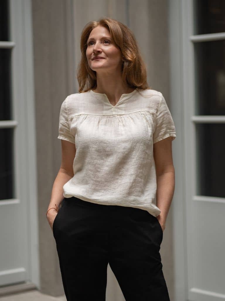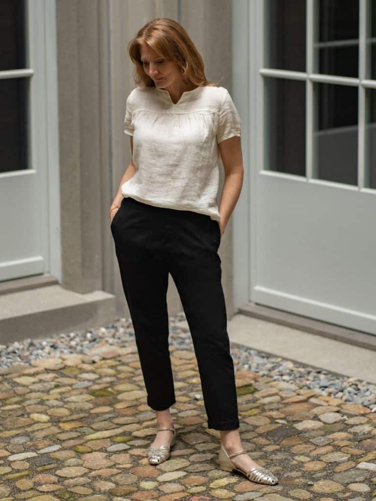 TRINE ist ein klassisch geschnittenes Kleidungsstück in normaler Passform. Wenn du weniger Oberweite hast, kannst du eine Grösse kleiner wählen, während grössere Grössen länger ausfallen. Im Vorderteil ist es leicht gerafft.